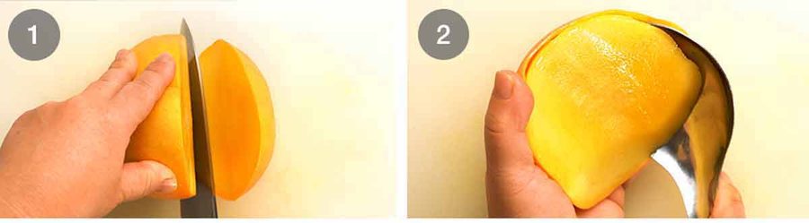Chopping the mango – We also need chopped mango to stir into the mango. To do this, take a cheek and firstly slice it in half horizontally.