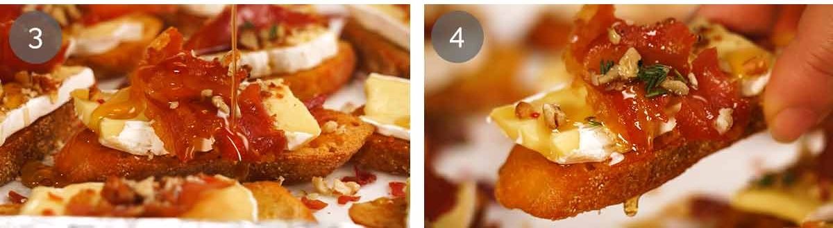 - Place a slice of brie on the crostini. Stick a crispy prosciutto shard in (or place/pile/crumble on top). Sprinkle with a pinch of pecans, drizzle with a tiny amount of maple, and lastly sprinkle with a few thyme leaves.
