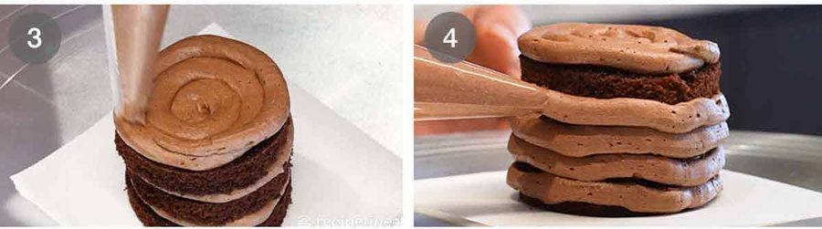 Layer – Place the 2nd cake layer on top, pipe another snail then cover with the 3rd layer.