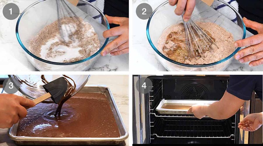 - Whisk dry – Sift the flour, cocoa, baking powder and baking soda into a bowl. Add the sugar and salt, then whisk to combine.