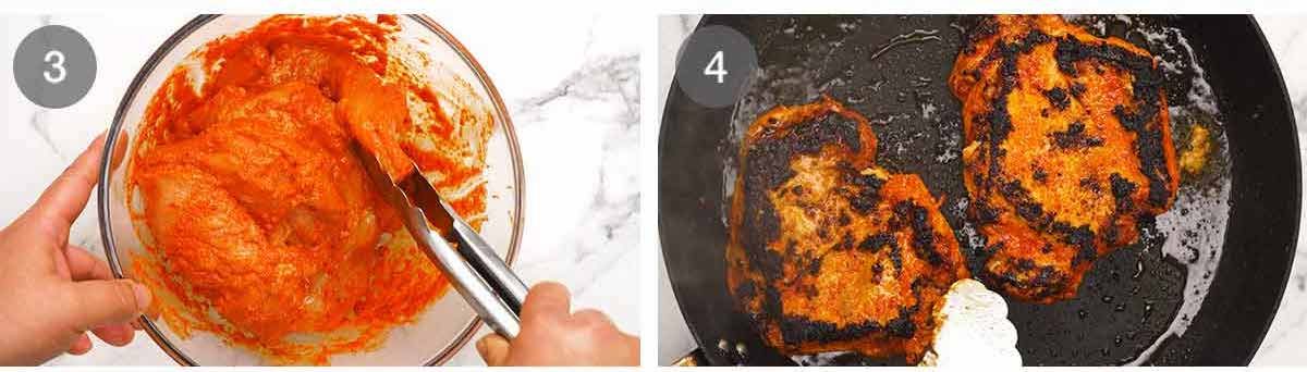 - Cook chicken – Heat 1 tablespoon of olive oil in a fry pan over medium / medium-high heat, OR brush BBQ grill with oil then heat. Cook breast for 3 minutes on each side, thighs for 4 minutes (in batches, if they won't fit in the pan), lowering the heat as needed if they are charring too much (char = legit!).