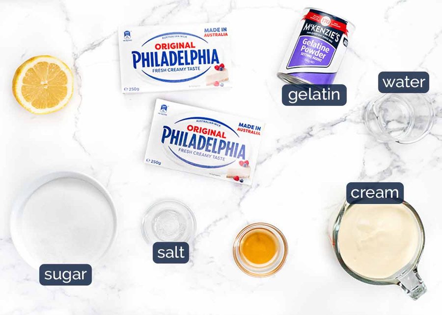 - Whip cream cheese β Put the cream cheese and sugar in a separate large bowl. Using the same beater (no need to clean), beat on high for 1 minute just until it's soft and smooth. Add the vanilla, lemon and melted gelatine, then beat for 10 seconds on high to mix it through thoroughly. Don't beat excessively as we don't want too many air bubbles in the cheesecake (unsightly).