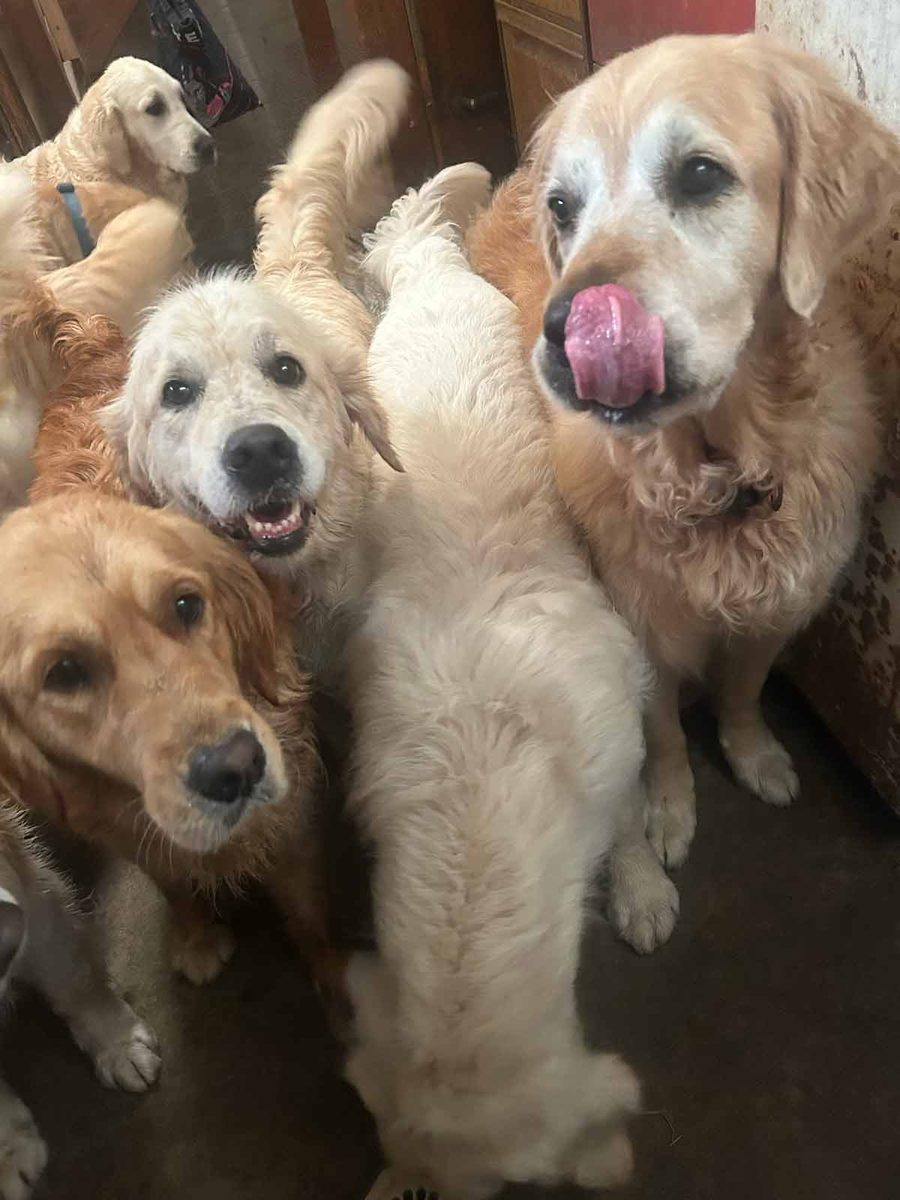 I had an off-site team conference last week so Mr Dozer got sent to the golden retriever boarder. This is the dinnertime photo she sent me. That’s Dozer on the right – the tallest one, smacking his lips in anticipation!