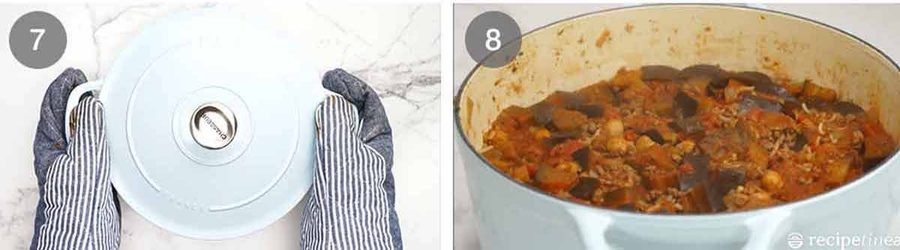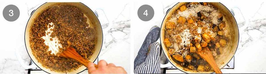 Eggplant and rice – Add the eggplant and toss to coat well in all the juicy beef. Mix until all the cubes are coated and change from white to red. Then add the rice and mix it through as well.