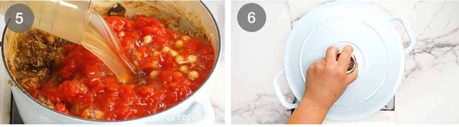 Cooking broth – Add the chickpeas, tomato, stock, salt and pepper. Give it a good stir and bring the liquid to a simmer..