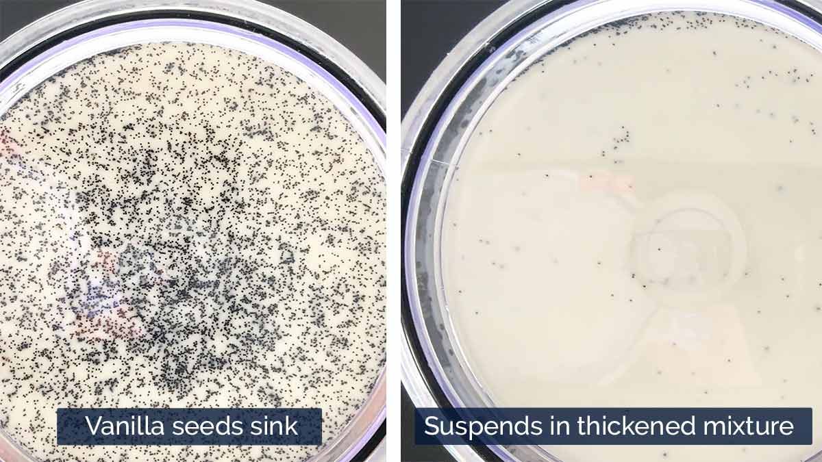 - Check thickness – After 1 hour, the mixture should be a pouring cream consistency. Stir, leave for 15 seconds then check the underside to ensure the vanilla beans aren't settling back on the base.(SOS: If you left it too long in the fridge and it sets, you can always gently re-melt in the microwave or stove and start again. Only make it warm, gelatine melts at a very low temp.)