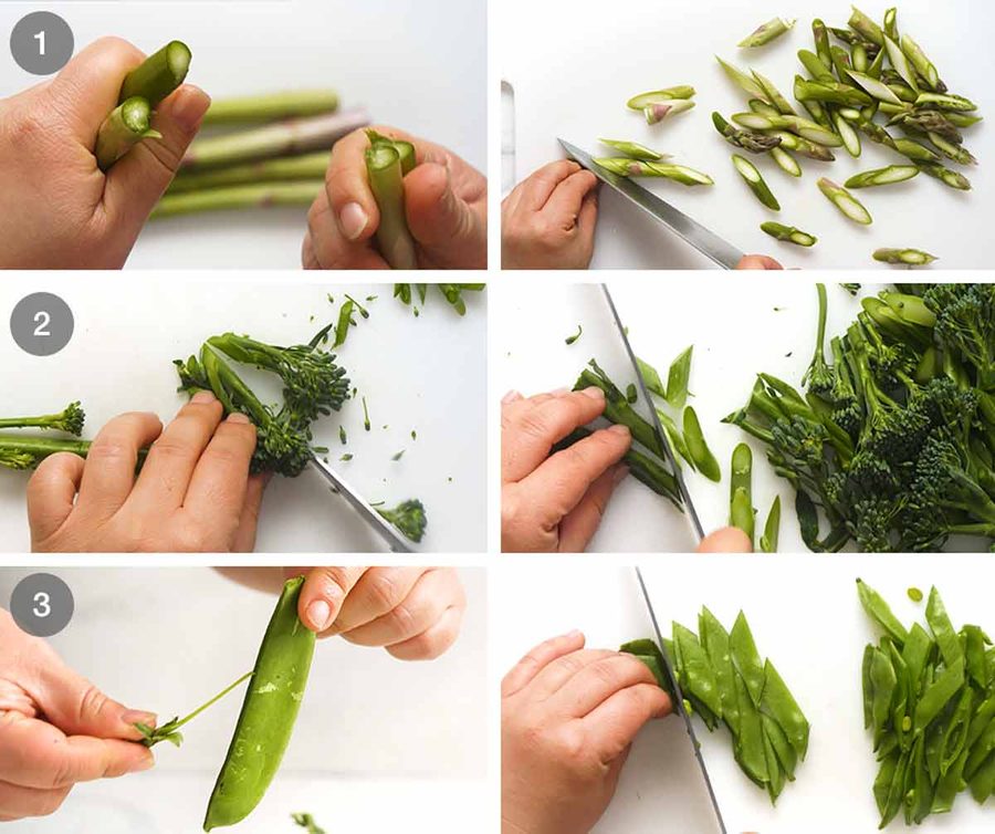 - Snow peas – Remove the tough string running down the "seam" of the pea. Stack several peas and slice on the diagonal about 1cm / 0.4" wide.