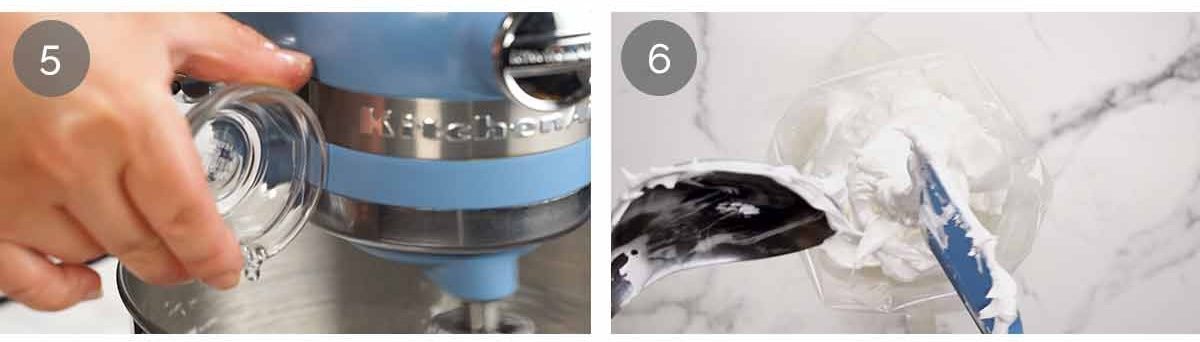 Gradually add sugar – In a stand mixer fitted with a whisk or handheld beater, beat the egg whites for 1 minute on high speed until soft peaks form. (I use speed 8 of 10 on my KitchenAid). Then with the beater still running, gradually add the sugar over 30 seconds. This keeps the whites more aerated and ensures the sugar dissolves properly.
