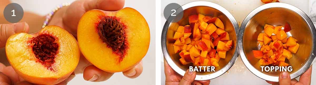 Use ripe but firm peaches. If they are overripe (ie squishy on the surface) it is difficult to cut and will turn a bit mushy once baked.