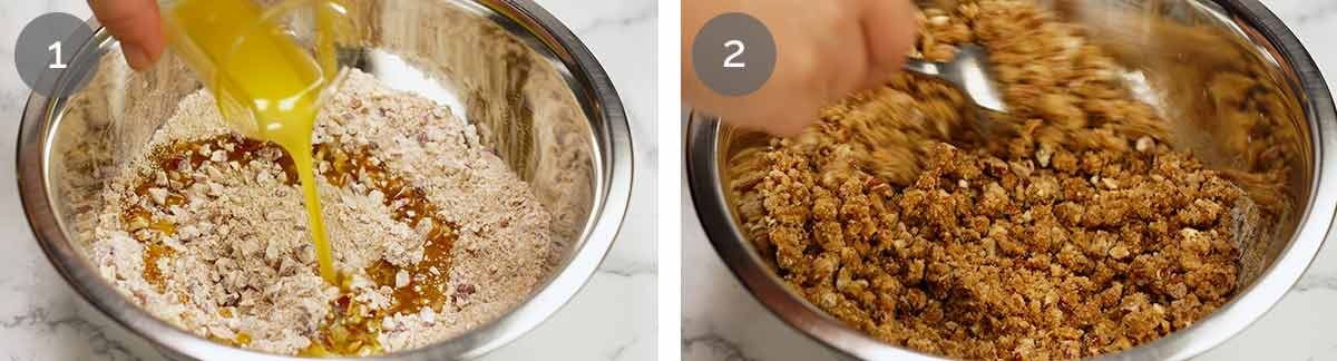 - Crumbly topping – Mix the flour, sugar, salt and chopped pecans using a fork in a small bowl. Add butter and mix until it resembles wet sand. Set aside.