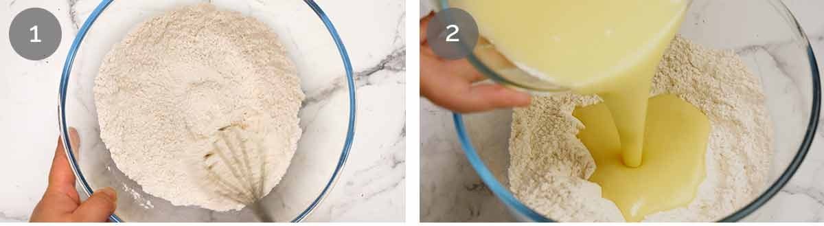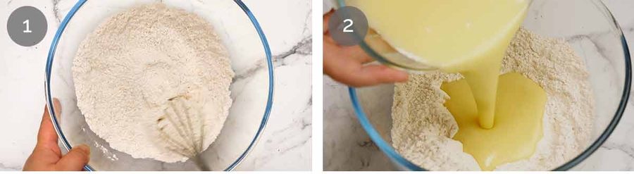 Whisk Dry and Wet ingredients in separate bowls. (Tip: Whisk the dry first then the wet so you don’t need to wash the whisk in between).