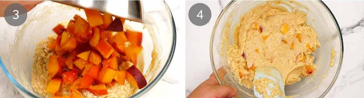 Add peaches – Pour the 1 1/4 cups of chopped peaches into the batter.