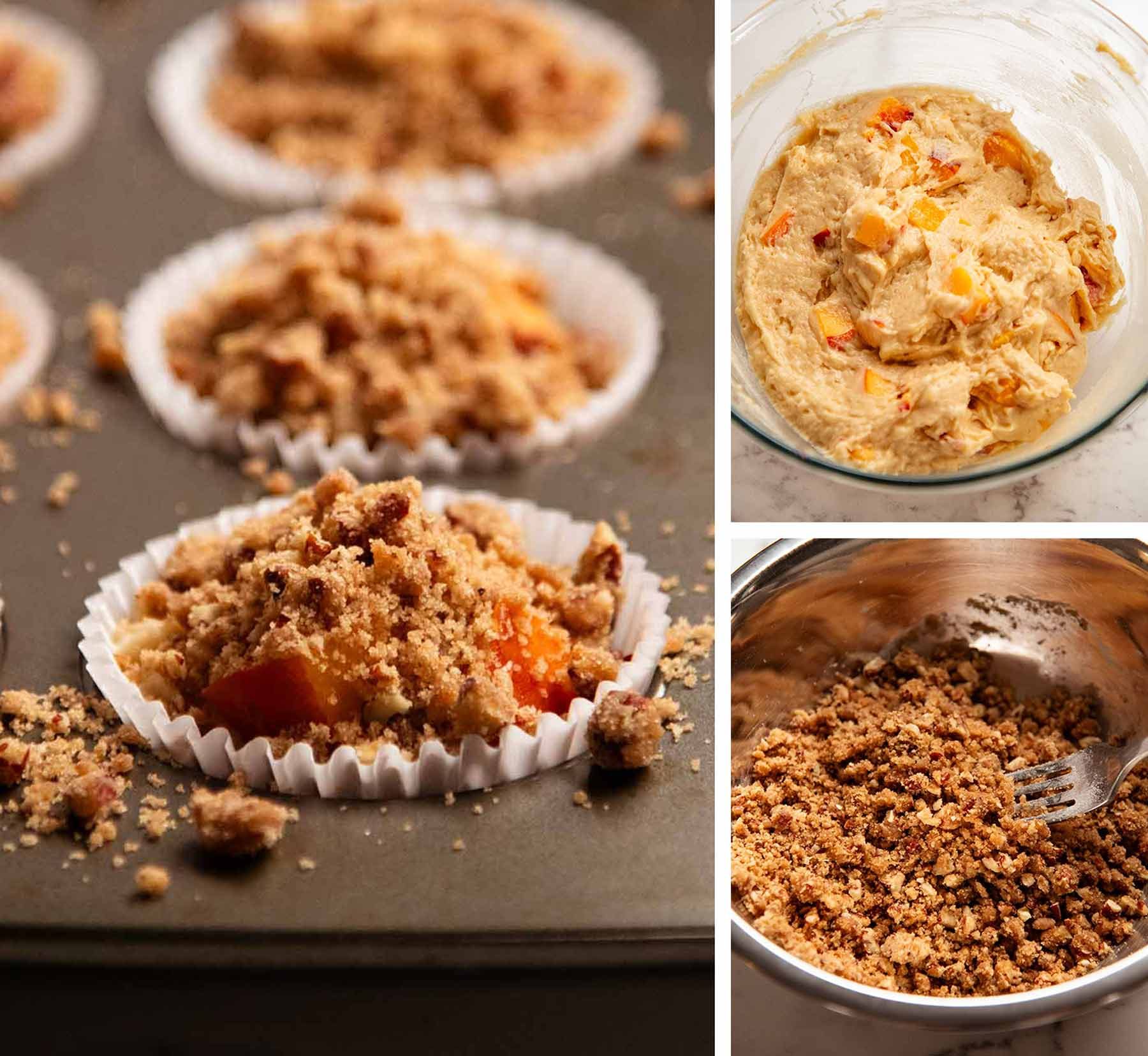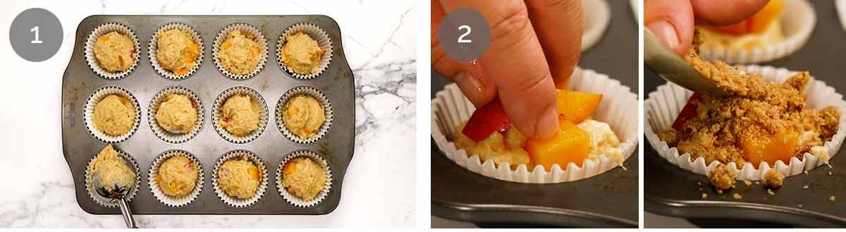 Top the batter with a few pieces of diced peaches, pressing them in lightly. Then spoon a mound of crumble on each. Use it all and pile it high! The crumble clumps and sets in the oven.