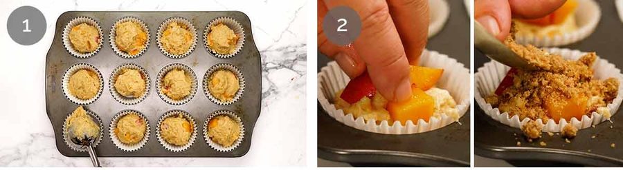 - Fill muffin tin – Working quickly (Note 4), divide the batter between the holes, filling to the top – a lever ice cream scoop is super useful here! Lightly press the Extra peaches on top of each muffin, then spoon the Crumble on – just pile it on top and use it all!