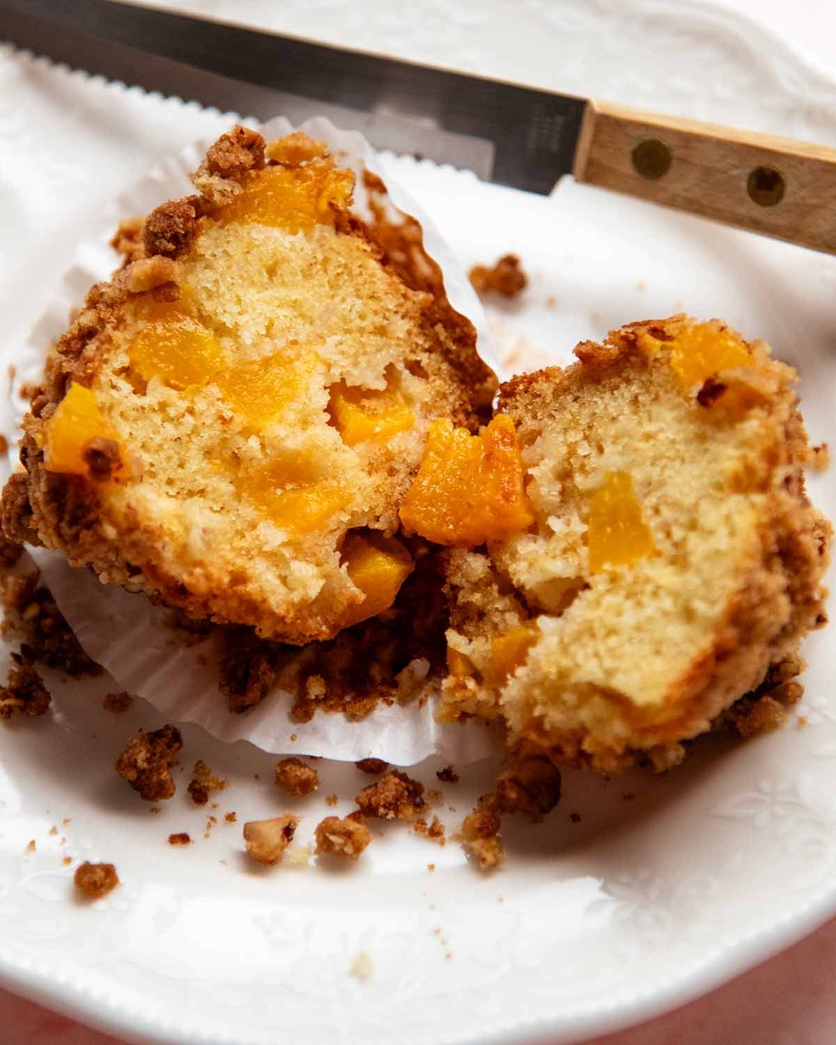 Treat it like an avocado – cut the peach in half by slicing around the natural seam, all the way to the stone. Twist the halves apart, remove the stone, then dice! Make sure to chop them fairly small as large pieces will sink, and also take up too much “space” in the muffin crumb (more small pieces in each muffin works better, I found).