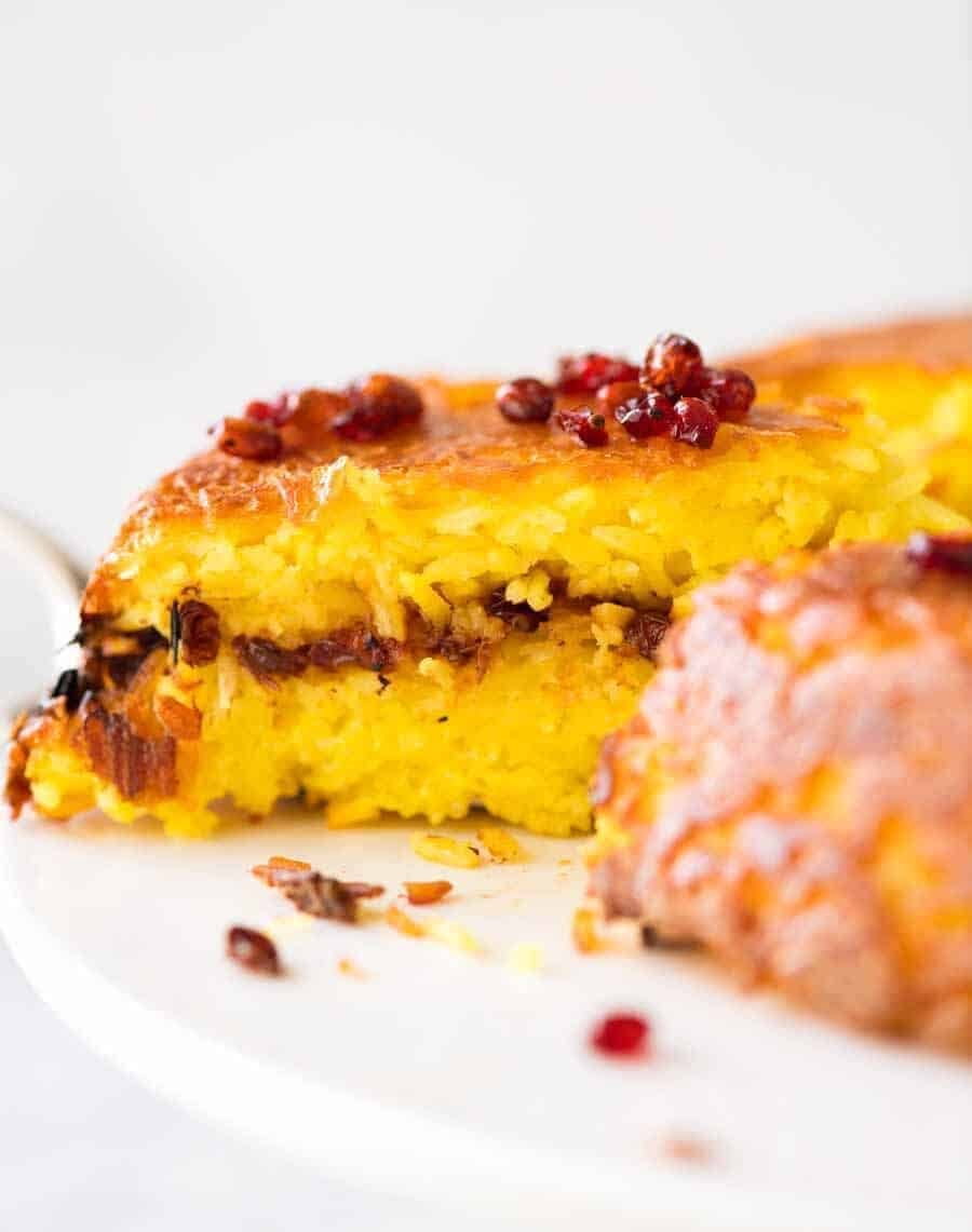 The key to this recipe is a yogurt-egg-oil-saffron mixture that is mixed with par boiled rice, then layered with barberries in a pie dish and baked until crispy on the outside.