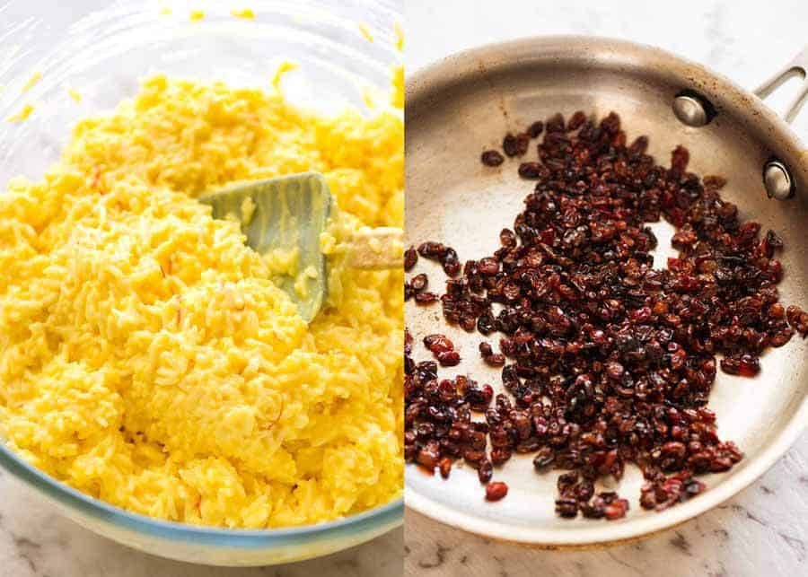 They look like dried pomegranates (is there such a thing??!!) and taste like sour cherries. A very Persian ingredient, you won’t find these in every day supermarkets but don’t fret! Yes, having barberries makes it authentically Persian. But from a flavour and visual perspective, it can be substituted with chopped dried sour cherries or cranberries.