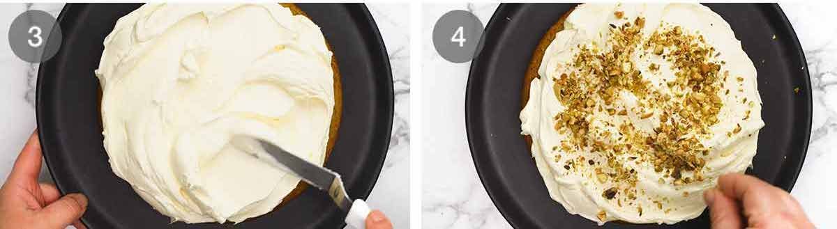 Here in Europe one can buy a pistachio butter (a bit like peanut butter/ paste. So I melt two tablespoons in the microwave and then blend it into the frosting. It really gives the frosting a lovely texture, flavour and slight green colour.