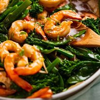 Got prawns? Got 15 minutes? Dinner is sorted with these plump and juicy prawns in a classic ginger sesame Chinese stir fry sauce, with snow peas and broccolini. It’s a Chinese restaurant standard!