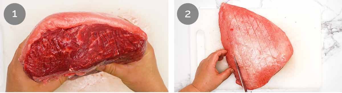 The rump is cut into thick slices 3-4cm.