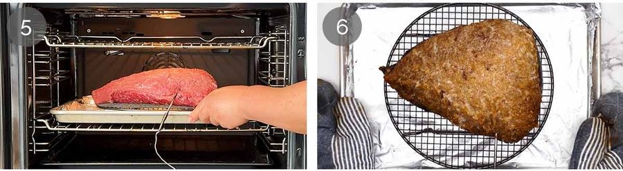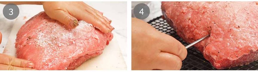 - Meat thermometer – Place the beef on a rack set on a tray. Insert an oven-safe meat thermometer into the middle of the thickest part of the beef, if using.