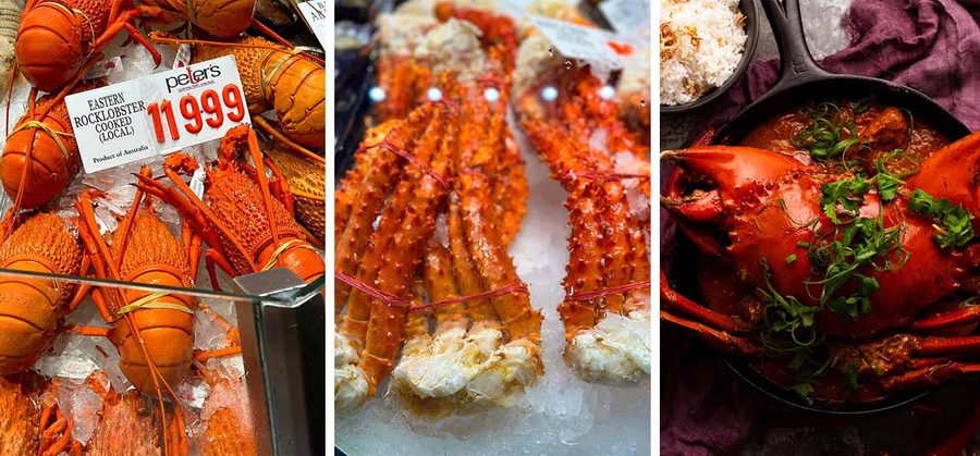 Spanner crab (~$35/kg) is also good value but the crab’s anatomy is very different to blue swimmer crabs. The meat is mostly in the body, which is proportionally large while the claws are small and flat. The crab flesh is deliciously sweet. However it is quite fine and more crumbly than other crabs. Buy it cooked. You don’t often see it raw.
