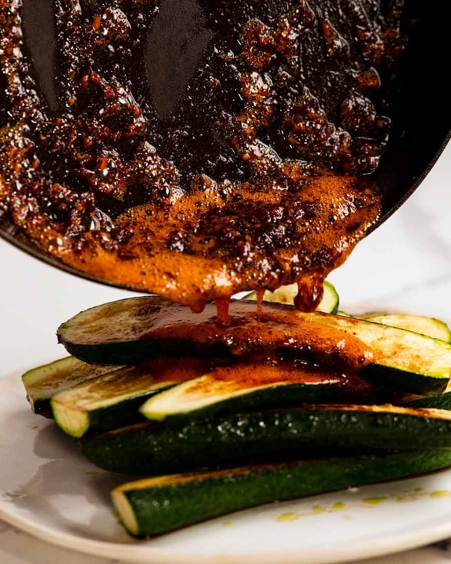 Pour the sauce over the pile of zucchinis. I do it this way for simplicity – the sauce goes “everywhere” – and I think it looks nice. The other way of doing it is to put the zucchini in the pan and toss to coat evenly.