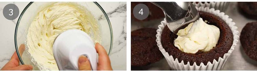 I use a little cream cheese which acts as a stabiliser for the whipped cream so you can keep the cupcakes for a 3 days without the cream melting into a puddle inside. It also a slight hint of welcome background tang in an otherwise rather indulgent treat!