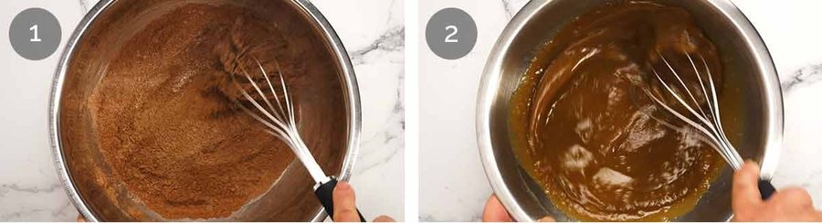 Mix Dry – Whisk the cocoa (don’t forget to sift out pesky lumps), flour, baking powder, baking soda and salt in a large bowl.