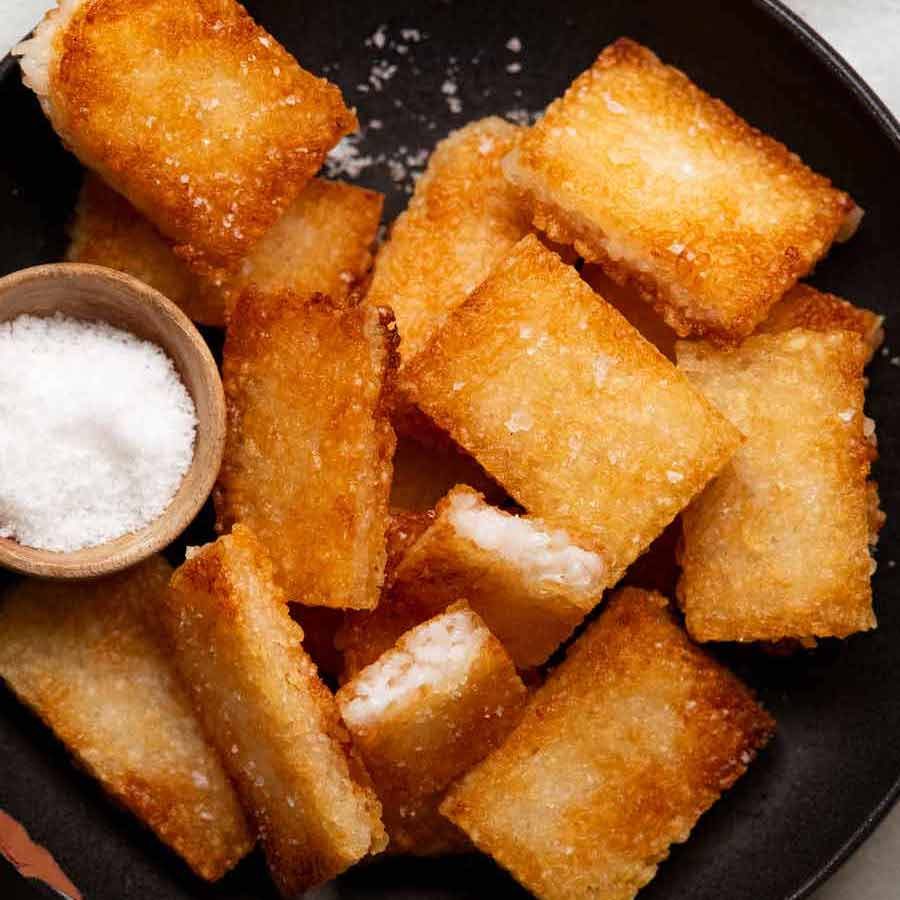 Pan fry - Heat about 1/4 cup of the oil in a large non-stick pan over medium high. Place in half the rice cakes - they should sizzle gently. Lower heat to medium. Cook for 4 minutes until really golden and crispy. Turn and cook the other side for 4 minutes.