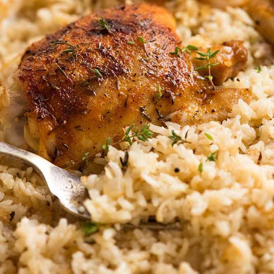 If scaling recipe up, use multiple pans. If scaling recipe down, use a smaller pan. Scale recipe using slider - click on Servings.1. Chicken - Bone in thighs is best because cook time is the same as rice and stays super juicy. Skin must be removed otherwise the rice will be too greasy. Just pull it off with your hands - it comes off easily.Drumsticks will also work great with this, no need to remove the skin and no change to cook time or temp.Boneless skinless thigh fillets or breast - put the rice in the oven covered with foil WITHOUT chicken. Bake for 30 minutes per recipe, then remove pan, take foil off, top with chicken then return to oven (no foil) for a further 20 - 25 minutes or until liquid in the pan is absorbed, per recipe. 2. Chicken Rub can be substituted with any seasonings you want! Lemon Pepper Seasoning, Italian Herb Mix - just use what you have.3. Rice - Any normal white rice works great here. Long grain white rice will yield the fluffiest rice. Short and medium grain will work fine too but by its very nature, is a bit stickier. Basmati and jasmine are terrific too - same cook time.Brown rice - add an extra 1/2 cup hot water. Bake covered for 1 hour then bake uncovered 15 minutes until rice is tender. Rice not suitable - Minute Rice, Risotto or Paella Rice.4. Nutrition assumes all the rice is consumed which it probably will not be.