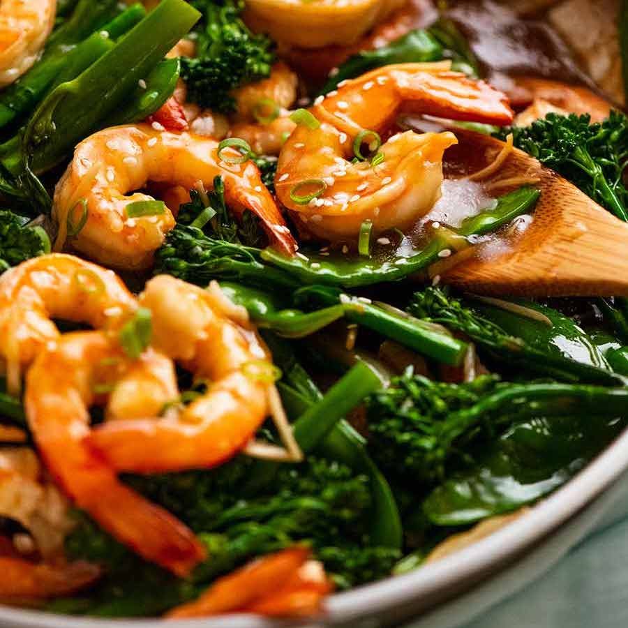 Recipe video above. Dinner is sorted with these plump and juicy prawns in a classic ginger sesame Chinese stir fry sauce, with snow peas and broccolini. It’s a Chinese restaurant standard!As with all stir fries, feel free to switch the vegetables for anything you've got!TOP TIP: The best way to ensure you don't overcook the prawns is to cook them first, remove, then add them back in at the end. Perfectly plump and juicy prawns, every single time!