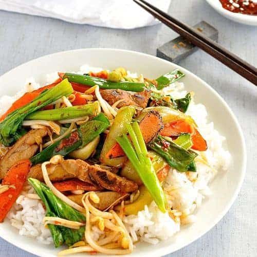 Add the carrots and bok choy stems and stir fry for 30 seconds, then add the sauce, chilli bean sauce and water and cook for 30 seconds to 1 minute until the sauce thickens.